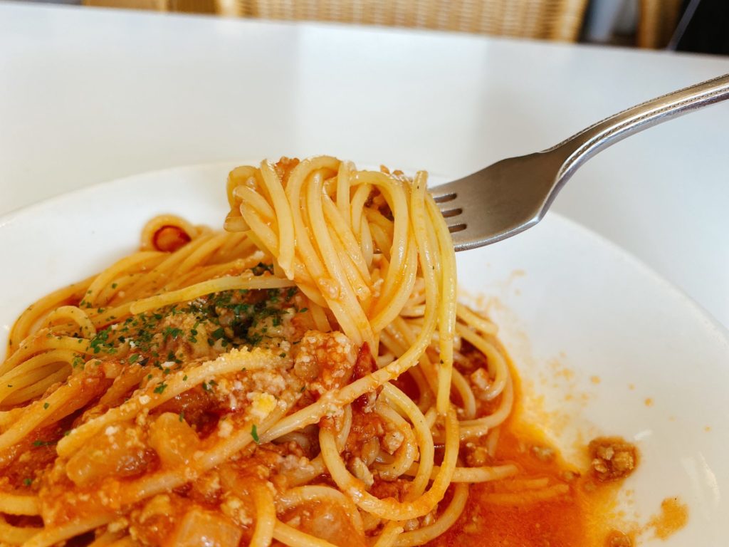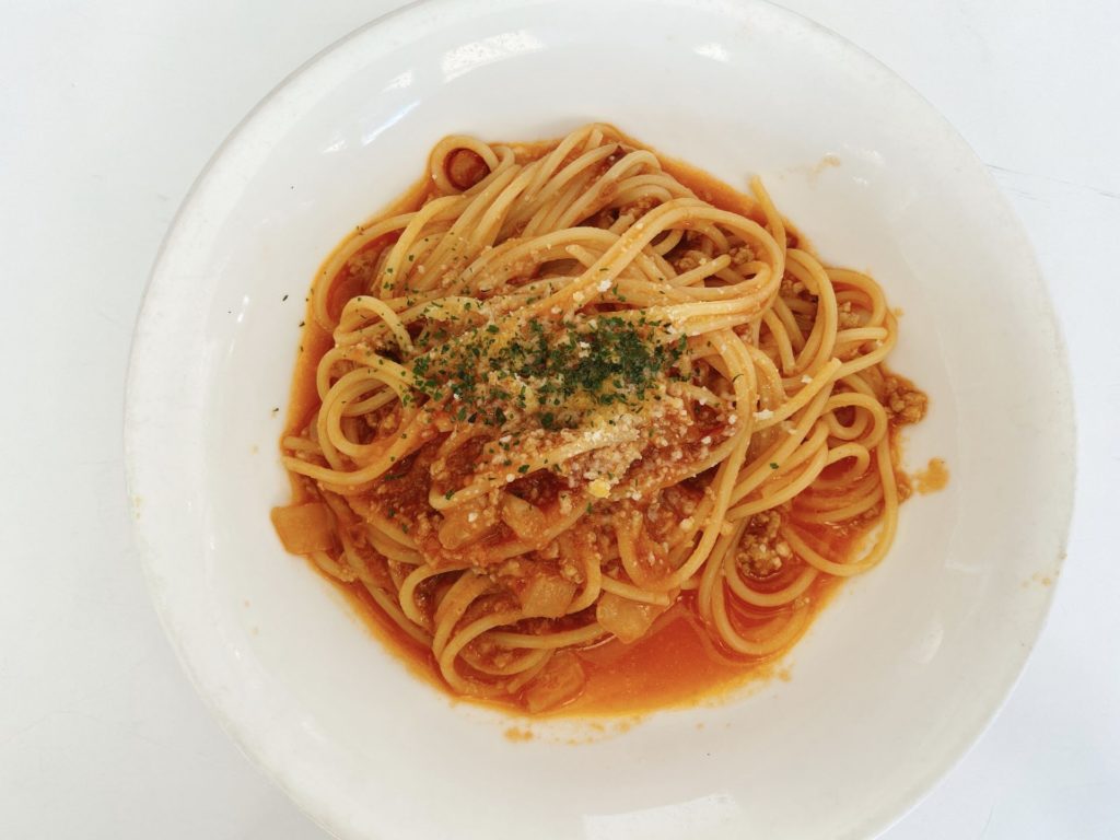 まず日替わりハーフパスタですが、今日はひき肉のピリ辛トマトとの事。