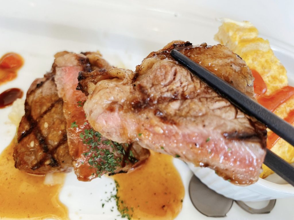 ステーキもいい大きさにカットしてあるので、全部お箸で食べらるのがいいですね。