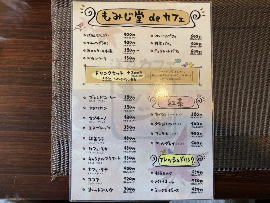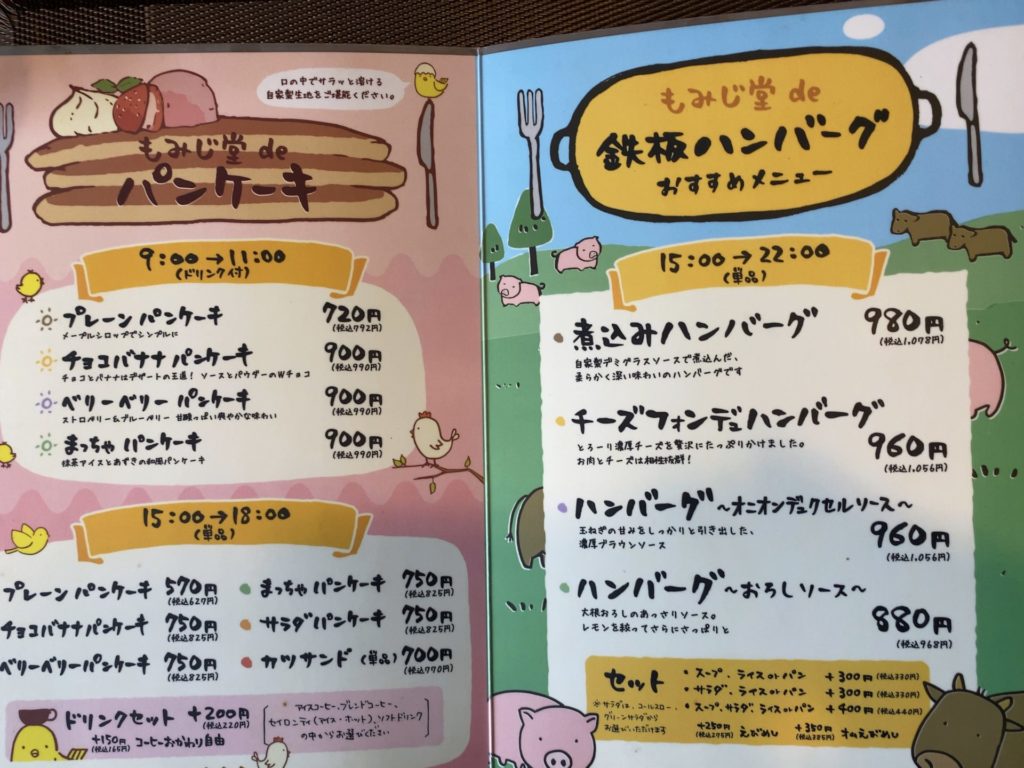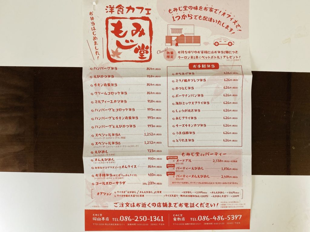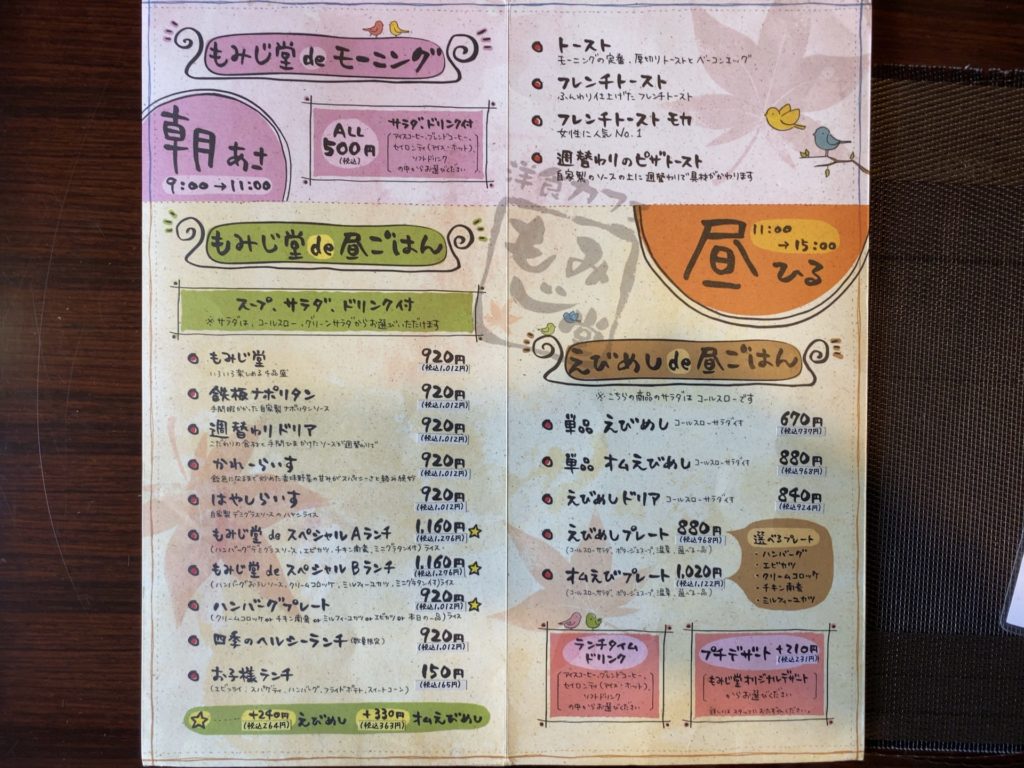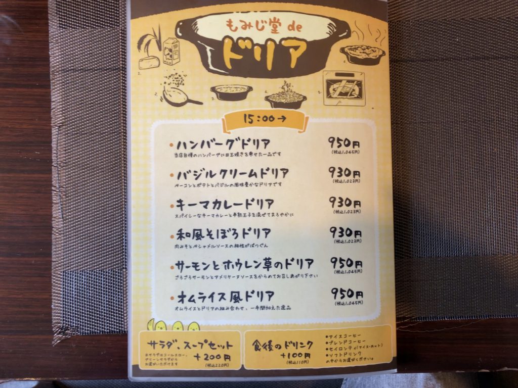もみじ堂のランチメニューは、ナポリタン・ハンバーグ・ドリア・えびめし等、洋食系が並びどれも美味しそう!