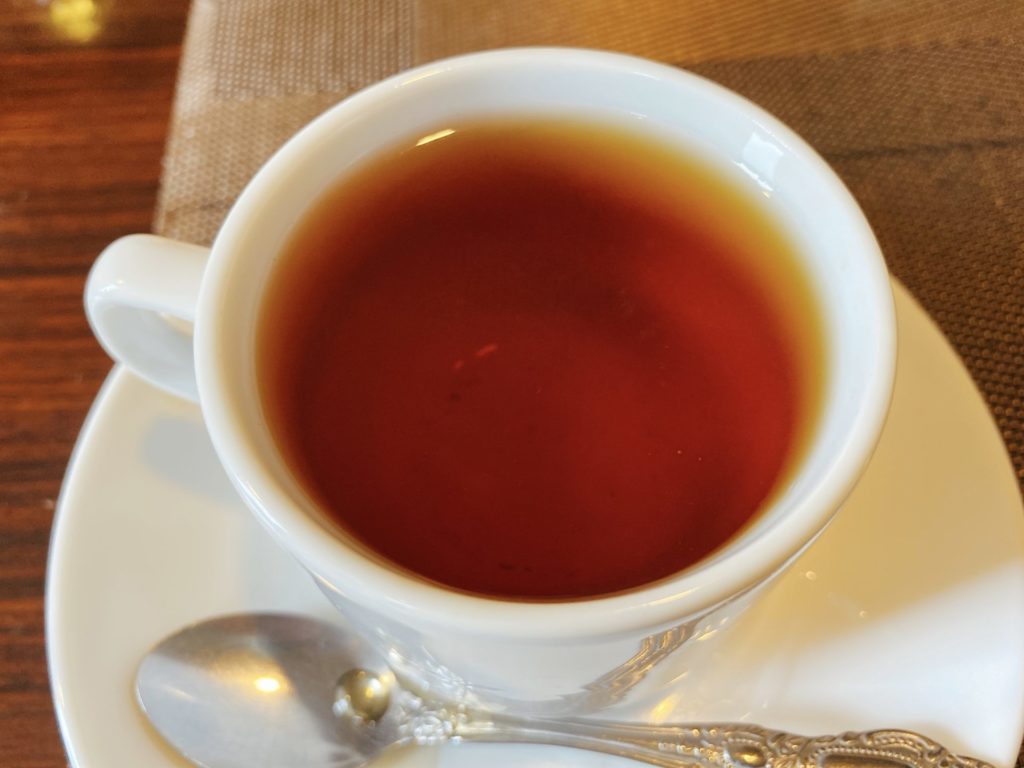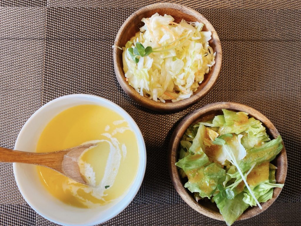 サラダは、コールスローとグリーンサラダを一つずつ、パンorライスは2人ともパン、食後のドリンクはホットティーを選択。