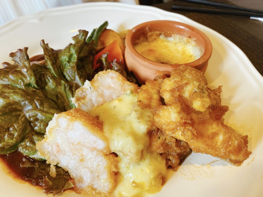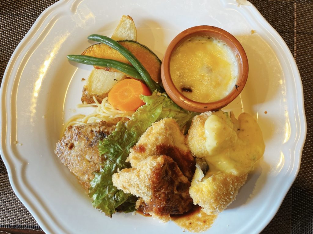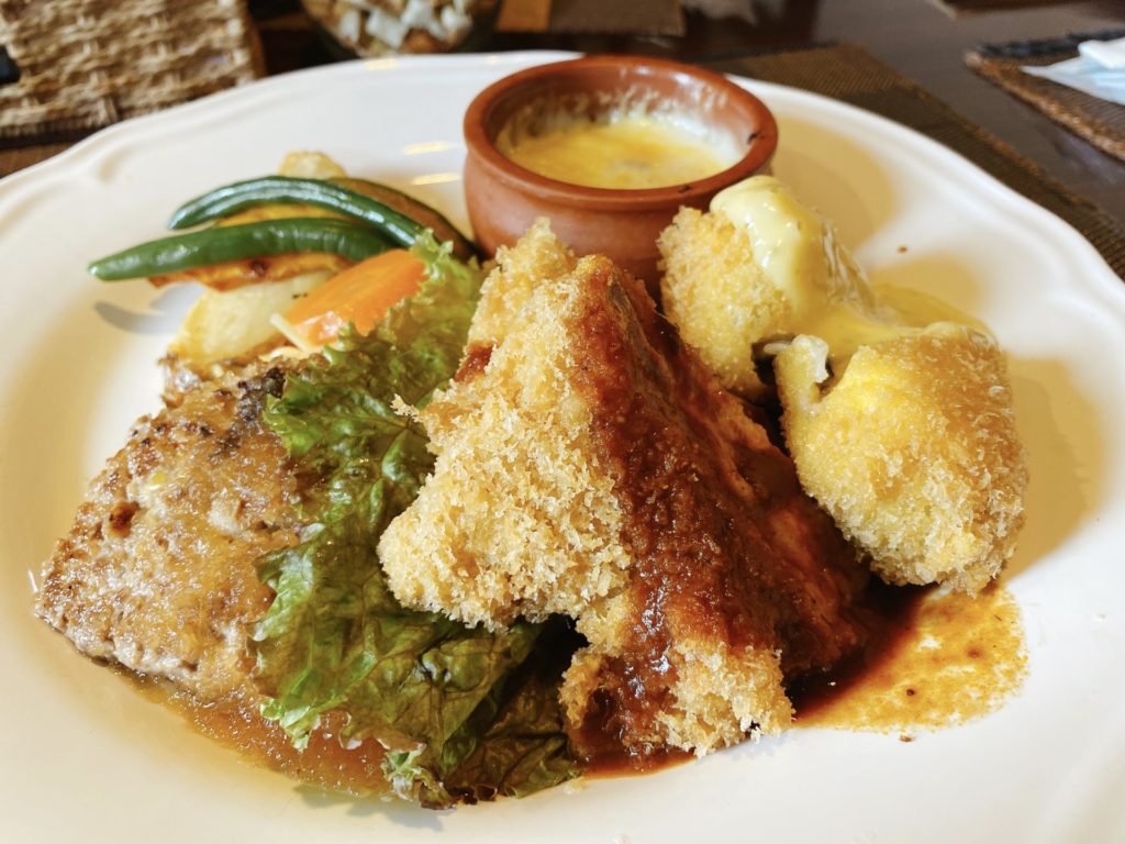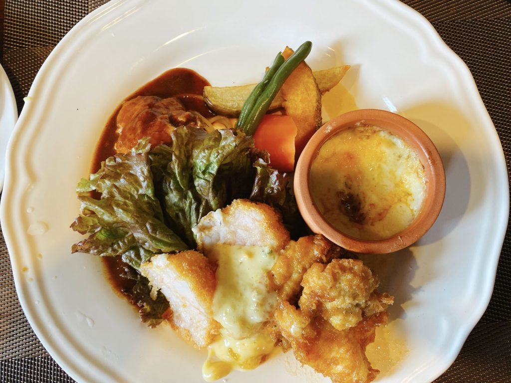 サニーレタスの下がハンバーグおろしソース、右側がミルフィーユカツ、クリームコロッケ、そしてミニグラタン。