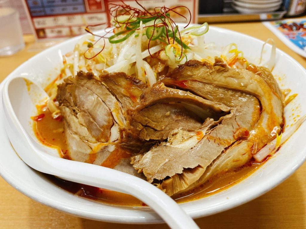 らーめん食楽の人気の秘密は、デカ盛りと激辛!?一番人気の「魔王」を激辛&太麺にてオーダー 野菜と背脂は普通で!