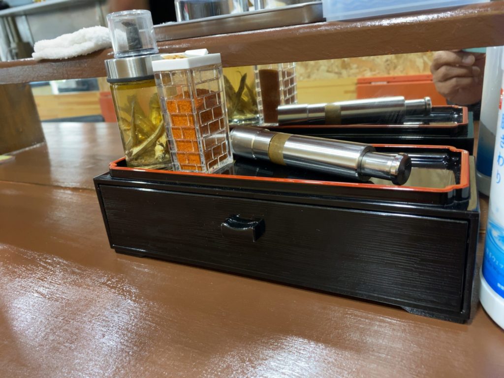 カウンターの調味料は、煮干し酢、一味、そして銀色の筒のような容器に入っているのがブラックペッパーですね。