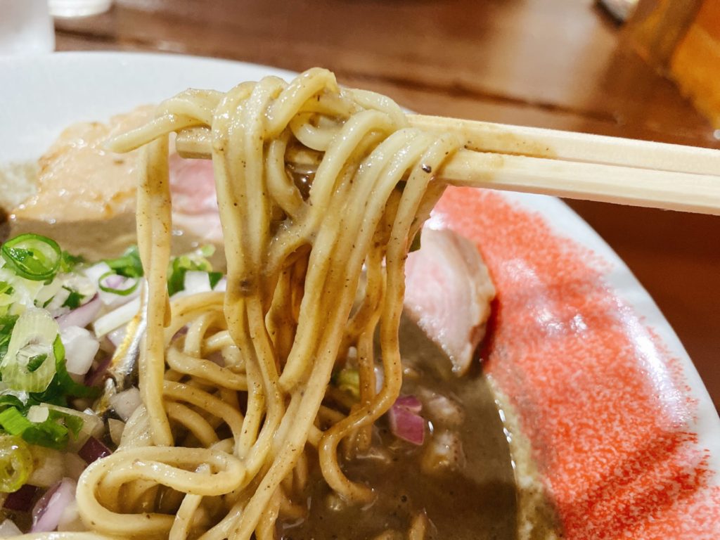 セメント系と言われるスープも独特ですが、真ん中のキラリと光る、食ってみろと言わんばかりの煮干しに目が留まります。