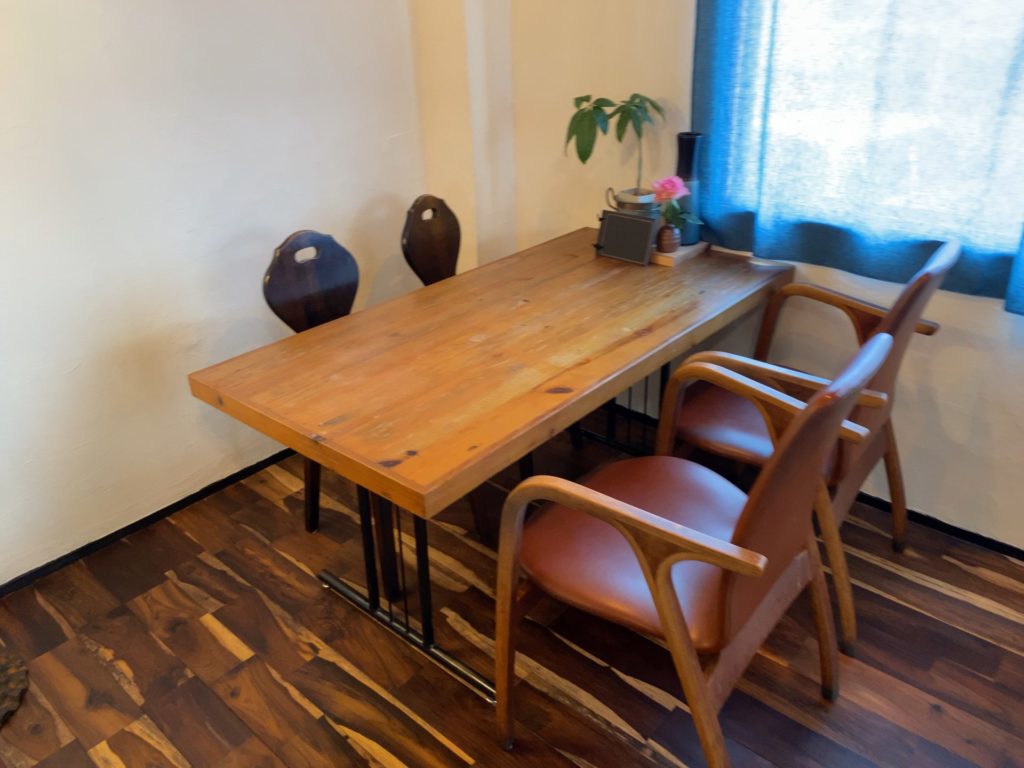 こちらが2人用テーブルですが、木製のテーブルと椅子、そしてラック等に温かみを感じますね~。