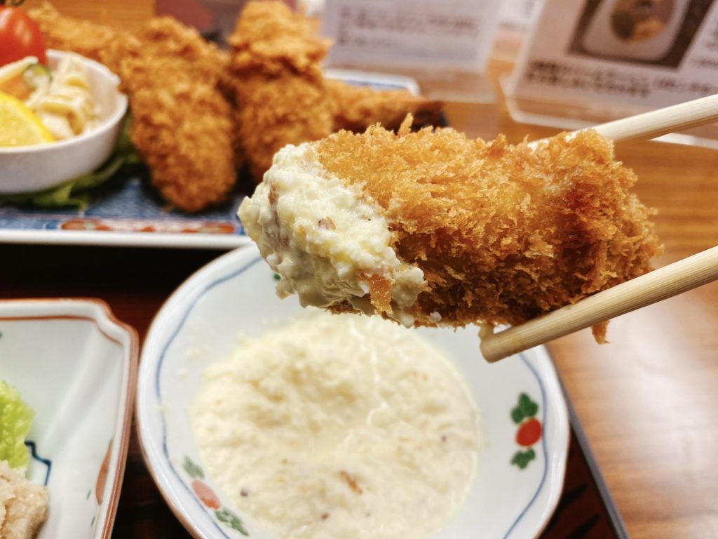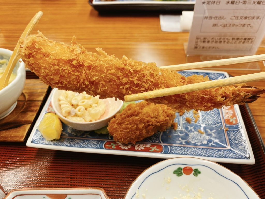 う越新の出来立て熱々の牡蠣フライと海老フライが予想を上回る美味しさ!サクサクでジューシー&プリップリ!