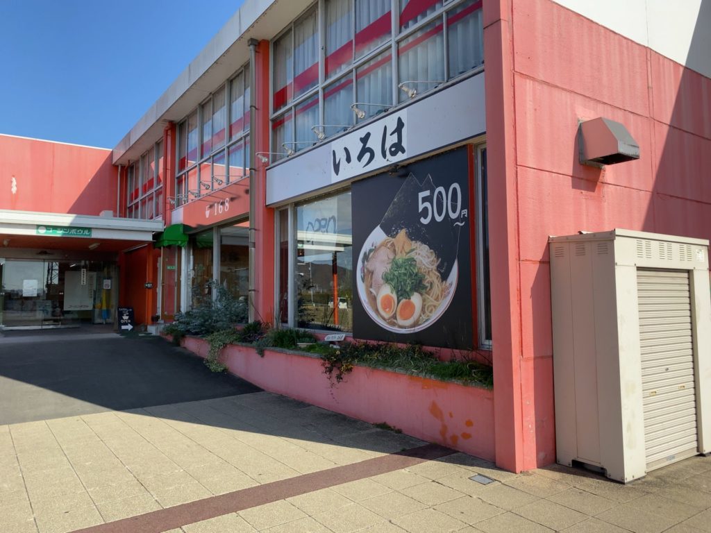 緑色のテントがあるところが備前いろは堂の入り口ですが、窓に掲げられた大きなラーメンの写真と「500円~」の文字がとても目立ちますね。