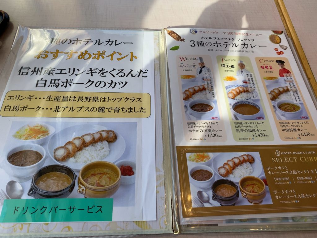 席についてメニューチェックですが、1ページ目が3種のホテルカレー。