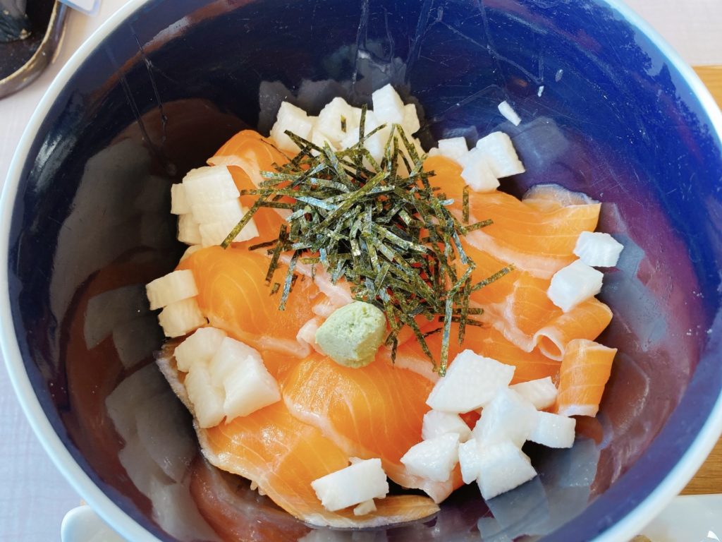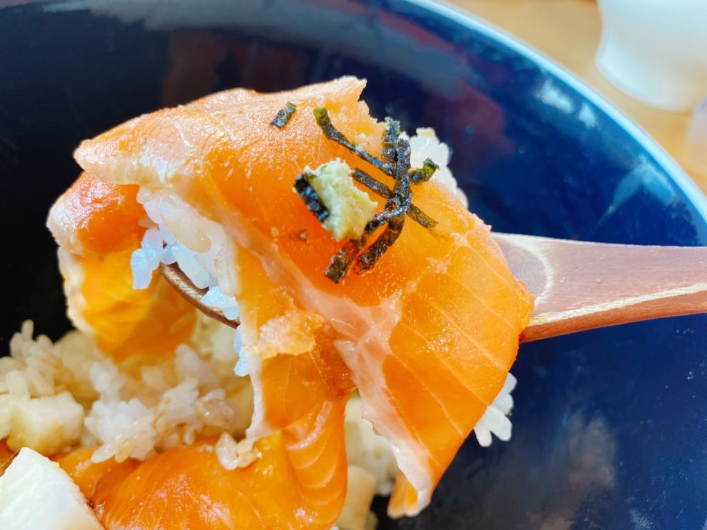 入り口の見本やメニューと違うような・・・と違和感を覚えた原因は、信州サーモン丼に乗せられた山芋ですね。
