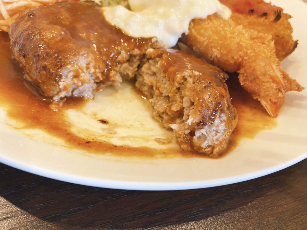 肉汁溢れるハンバーグと大きなエビフライ、カニクリームコロッケのどれもがメニュー写真以上の出来映え!
