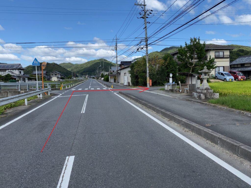 TSUTAYAの方から行くと、熊山方面へ、ネオポリスを超えて岩梨中学校とかがあるファミリーマート赤磐沢原店の三差路を左折して熊山英国庭園の方に向かいます。