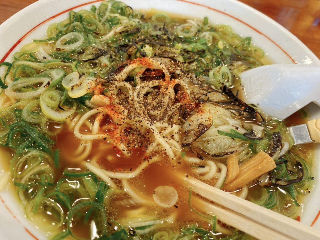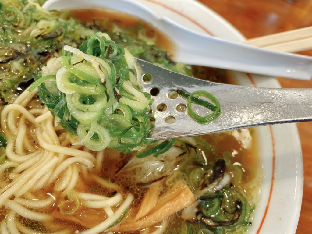 緑らぁめんは、たっぷりのネギと炙ったネギの香ばしさで、鶏ガラを基本としたスープに更に深みを与え旨味を増す!